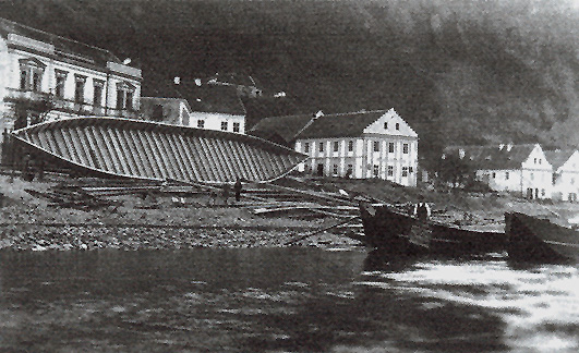 Známá Chroustova loděnice ve Štěchovicích s rozestavěným šífem.